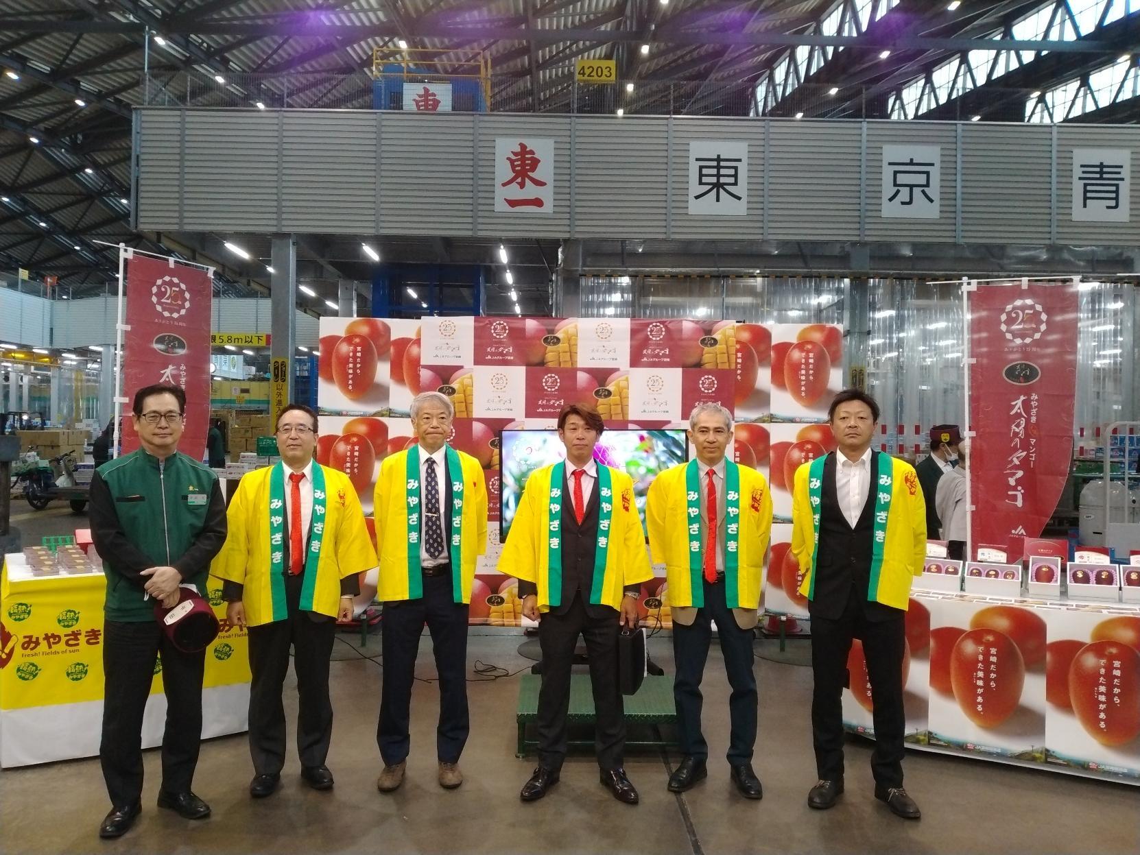 みやざき完熟マンゴー「太陽のタマゴ」が2023年(令和5年)4月13日(木)に解禁され、東京の大田市場で生産らによるPRが行われました。