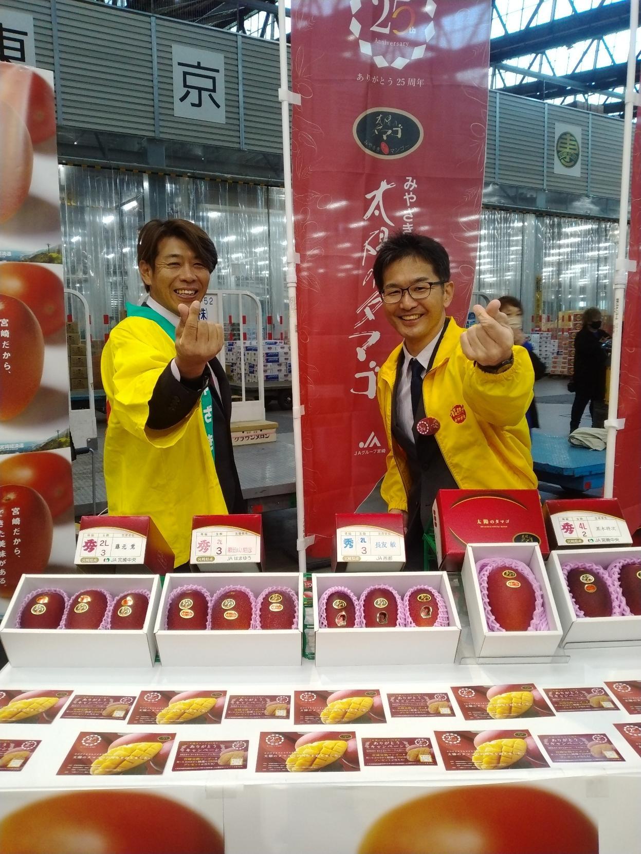 みやざき完熟マンゴー「太陽のタマゴ」が2023年(令和5年)4月13日(木)に解禁され、東京の大田市場で生産らによるPRが行われました。