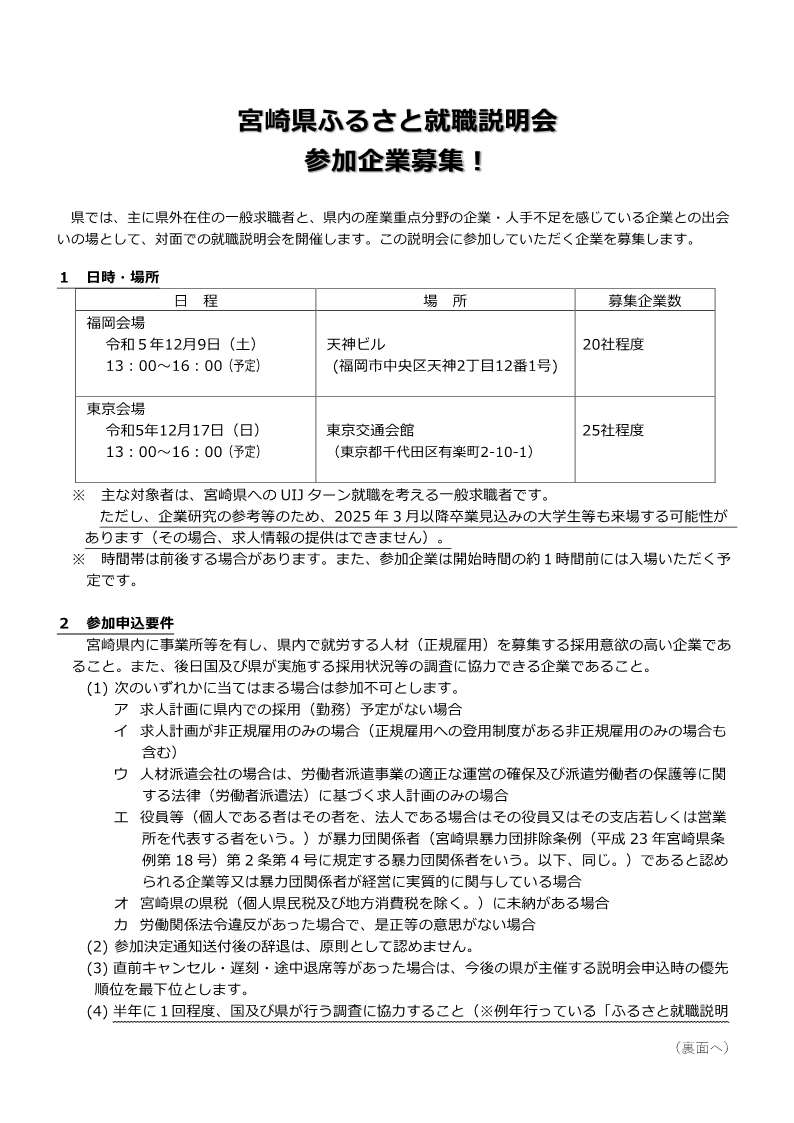 宮崎県では、12月に東京都(有楽町)で開催する「宮崎県ふるさと就職説明会」に参加していただける企業を募集しています。
