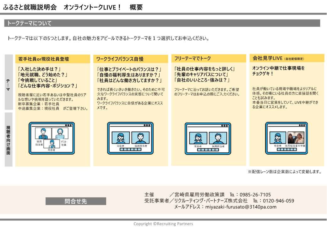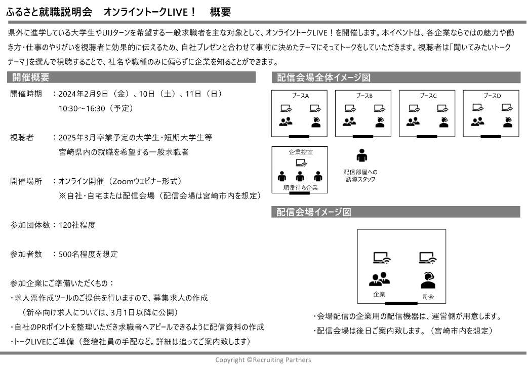 宮崎県では、2月に開催する「宮崎県ふるさと就職説明会」でオンライントークLIVE!に参加していただける企業を募集しています。