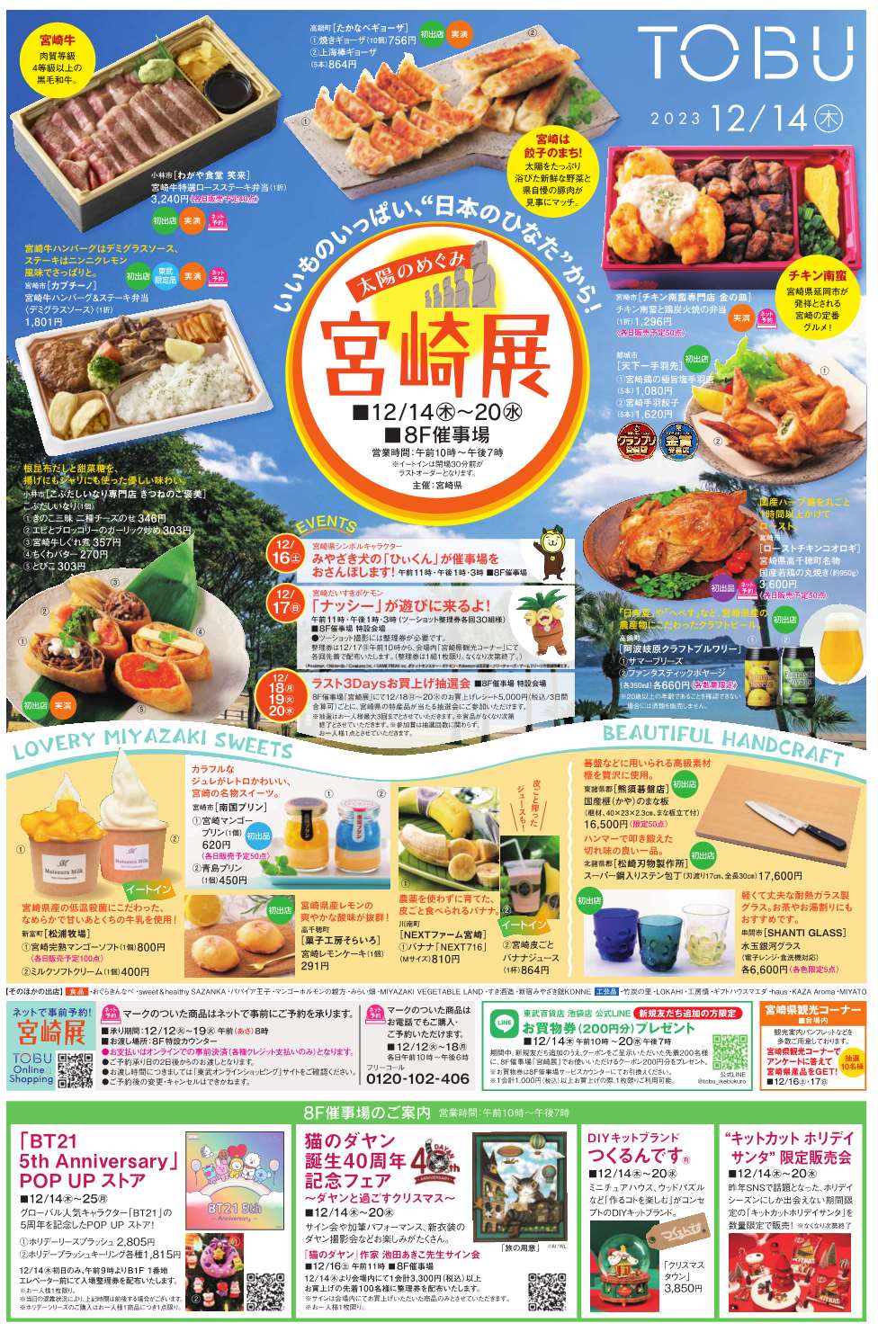【お知らせ】東武百貨店池袋店で「太陽のめぐみ宮崎展」が開催! 東武百貨店池袋店8階催事場にて宮崎物産展を開催します。 食品・工芸品合わせて29社が出店するほか、16日(土)にはみやざき犬、17日(日)には宮崎だいすきポケモンの「ナッシー」が宮崎物産展に初登場します。 1 日程 令和5年12月14日(木)~20日(水) 2 時間 各日10時~19時 (注)イートインは閉場30分前がラストオーダーとなります 3 場所 東武百貨店池袋店8階催事場(東京都豊島区西池袋1-1-25) 4 出展事業者 宮崎県内企業29社(食品19社、工芸品10社)