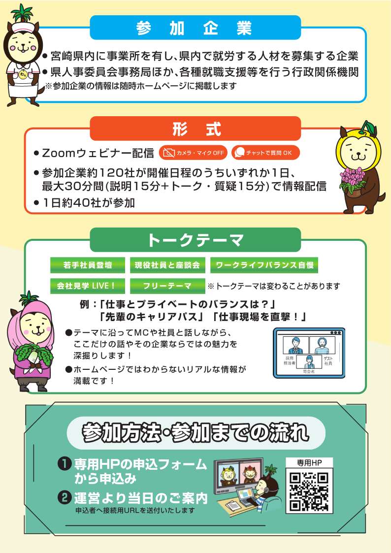 宮崎県では、宮崎労働局との共催により、県内企業約120社が参加するオンライン就職説明会を開催します。