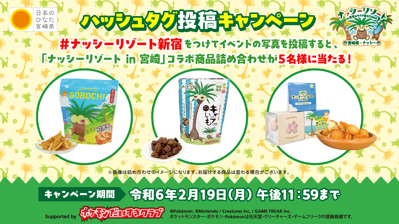 キャンペーン期間中、「ナッシーリゾート in 新宿みやざき館KONNE」イベントに関する画像とともに、ハッシュタグ「#ナッシーリゾート新宿」をつけて、X又はInstagramに投稿した方のうち、抽選で5名様「ナッシーリゾート in 宮崎」コラボ商品詰め合わせプレゼントします。