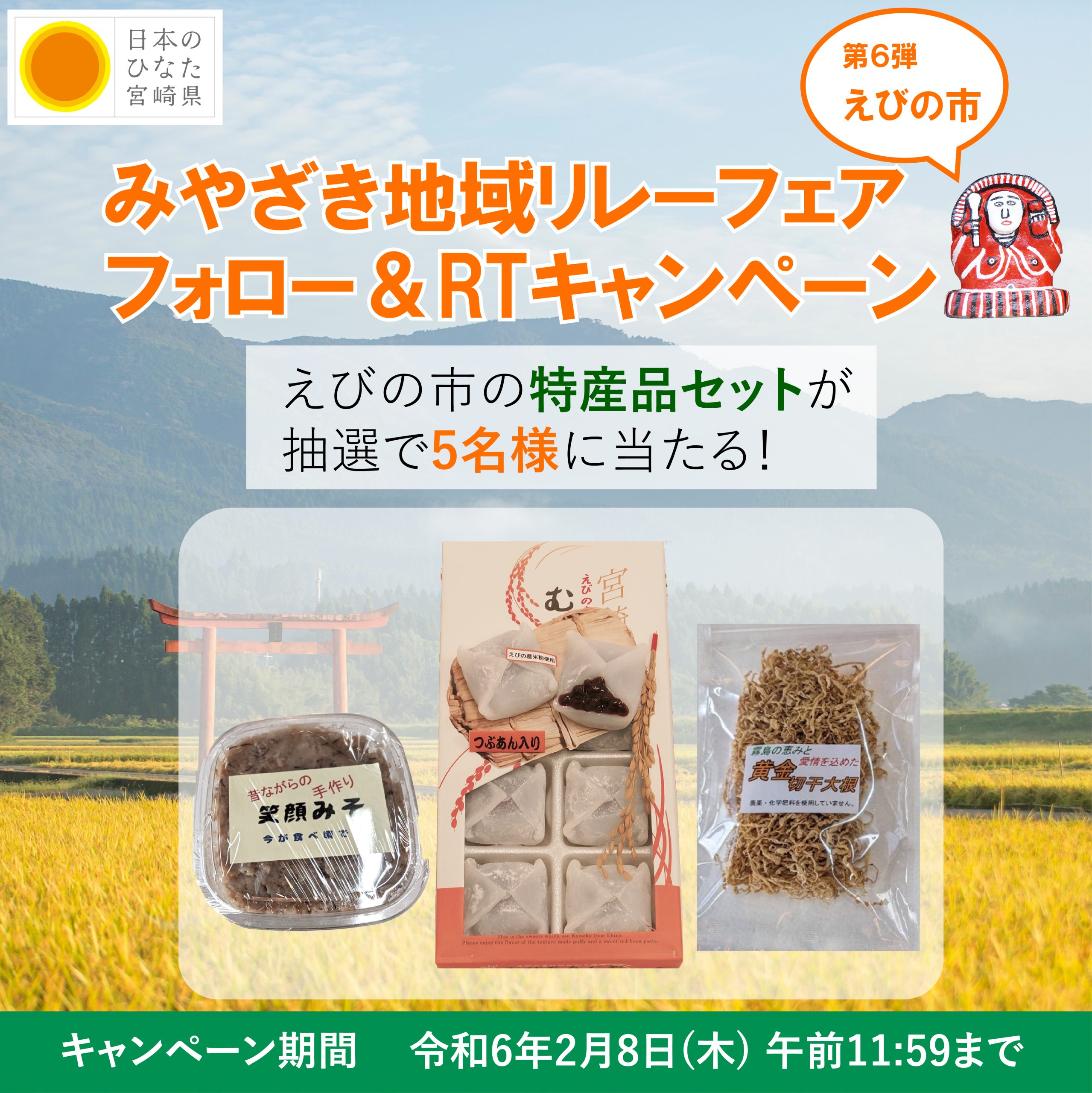 【概要】キャンペーン期間中、「宮崎県東京事務所公式X(Twitter)(@miyazakip_tokyo)」をフォローし、キャンペーンの投稿をリポスト(リツイート)した方から、抽選で5名様にえびの市の特産品セットをプレゼントします。