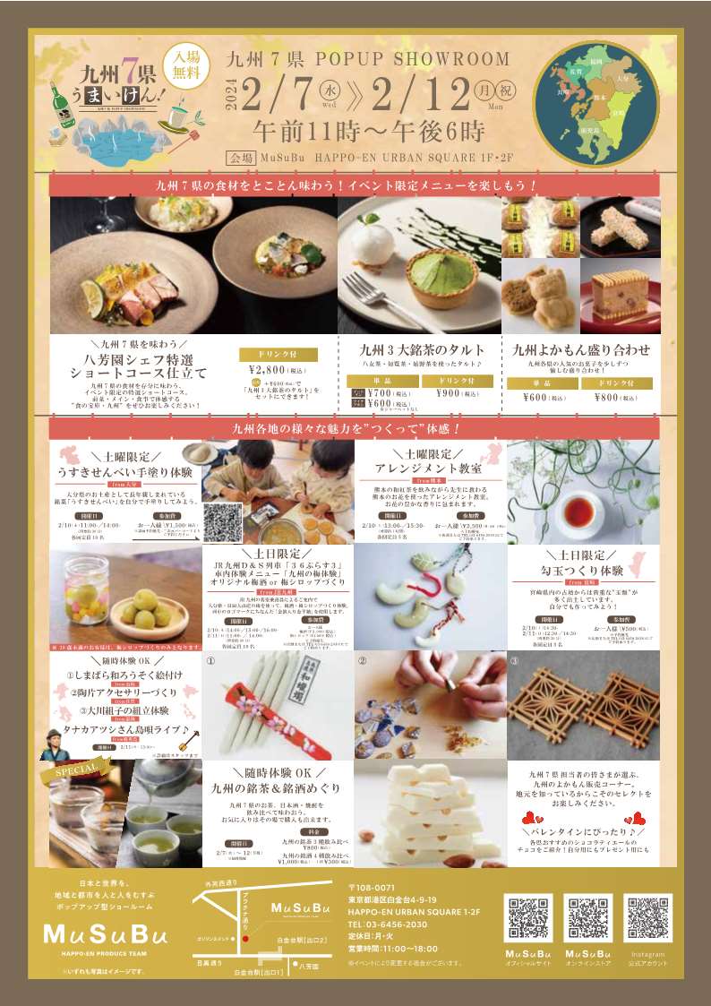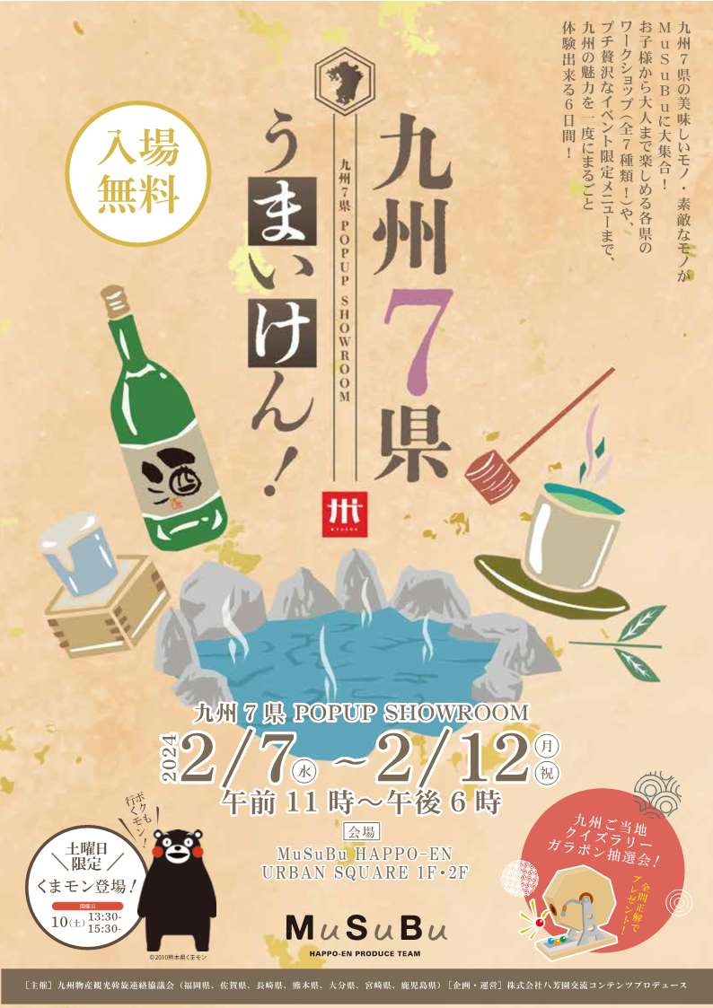 九州物産観光斡旋連絡協議会(福岡県、佐賀県、長崎県、熊本県、大分県、宮崎県、鹿児島県)が、2024年2月7日(水)から2月12日(月・祝)の5日間、東京・白金台の「MuSuBu」にて物産・観光のイベント「九州7県うまい県!」を開催します。