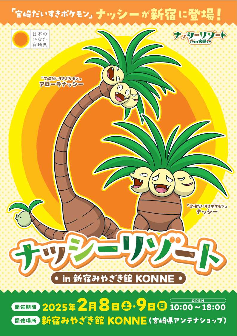 今回の2日間も、「宮崎だいすきポケモン」ナッシーが「新宿みやざき館KONNE」に登場し、一緒に記念撮影ができるグリーティングや、宮崎県各地の特産品とナッシーがコラボしたオリジナル商品の販売、そして宮崎県名産の完熟きんかん「たまたま」がナッシーの進化前の姿であるたまごポケモン「タマタマ」のオリジナルデザインのスタンドパックで並ぶなど、《宮崎県×ナッシー》全開で皆様をお待ちしております。