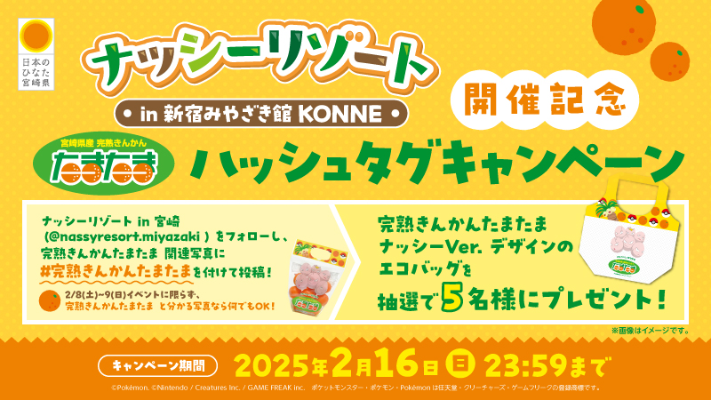 「ナッシーリゾート in 新宿みやざき館KONNE 開催記念 #完熟きんかんたまたま ハッシュタグキャンペーン」を以下のとおり実施します。
