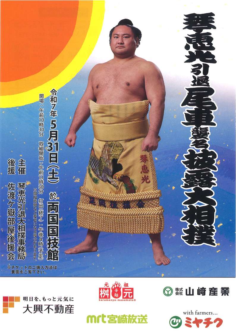 通算29場所幕内の座を守り、力士としては小柄ながらスピードを生かした攻めの相撲で長年にわたり県民に元気と活力を与えてくださった本県出身の元・ 琴恵光関の尾車親方襲名披露大相撲(断髪式)が5月31日(土)に両国国技館で開催されます。