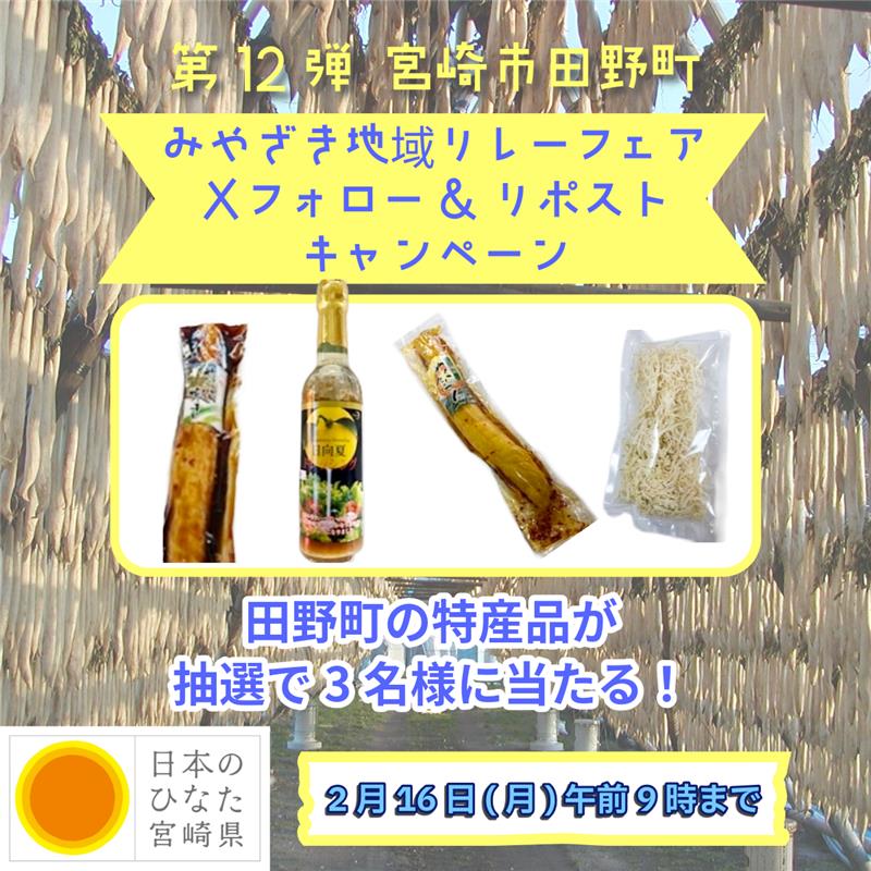 キャンペーン期間中、「宮崎県東京事務所公式X(@miyazakip_tokyo)」をフォローし、キャンペーンの投稿をリポストした方から、抽選で3名様に宮崎市田野町の特産品セットをプレゼントします。